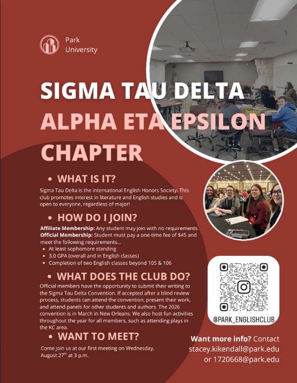 Sigma Tau Delta is open to any Park student regardless of location—both Parkville-area and distance students are welcome to participate, and we have activities for both. We offer two forms of membership:
